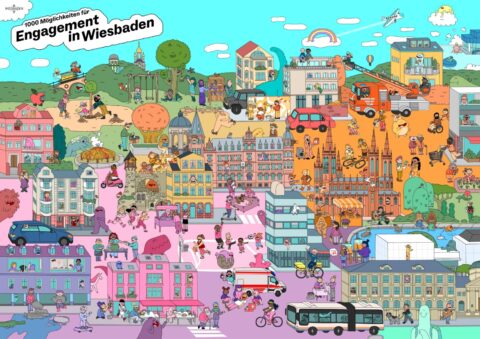 Die Stadt Wiesbaden hat jetzt ein neues Wimmelbild zum Engagement in der Stadt präsentiert. Es soll die Bandbreite ehrenamtlicher Aktivitäten